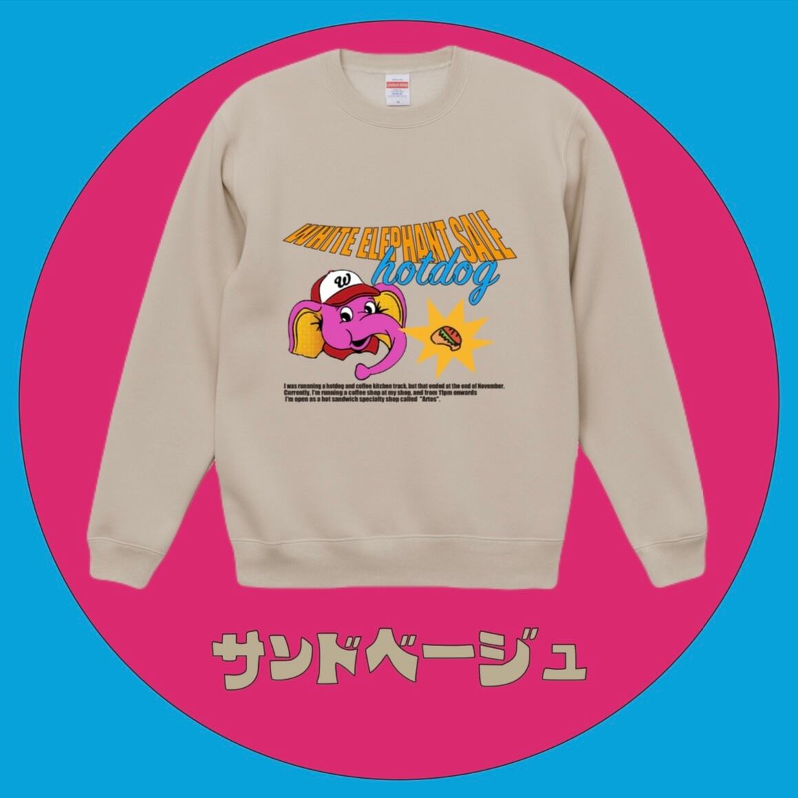 お店のシンボルである、ホットドッグゾウさんをフロントにプリントしたスウェットです。