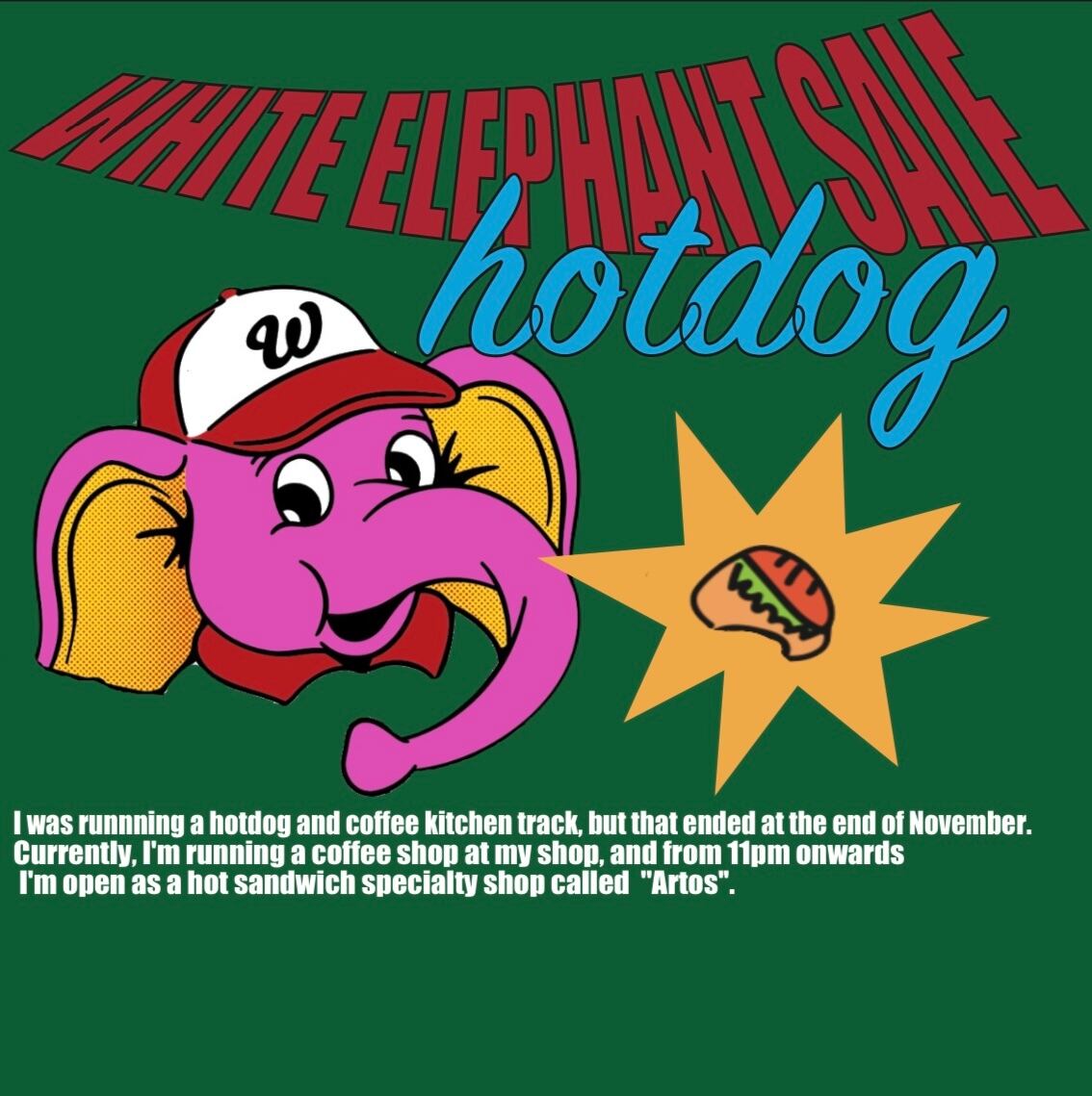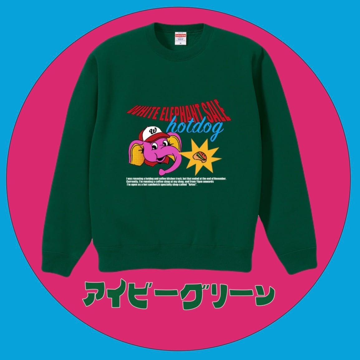 お店のシンボルである、ホットドッグゾウさんをフロントにプリントしたスウェットです。
